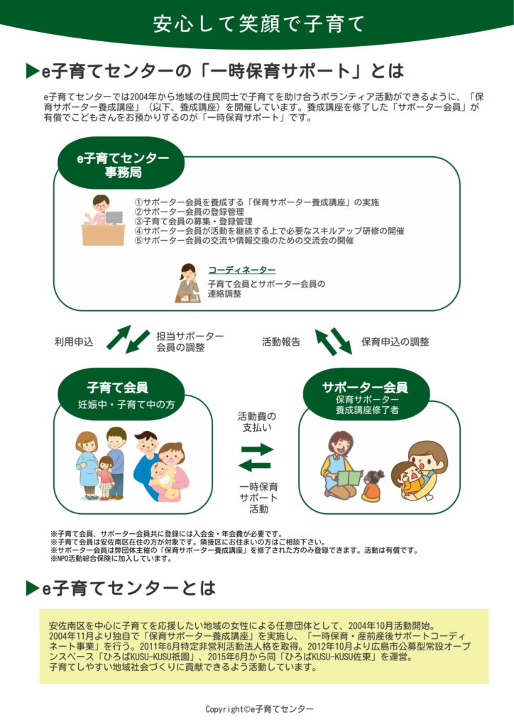 e子育てセンターでは主に安佐南区内で2004年より「一時保育・産前産後サポートコーディネート事業」として、会員の登録管理や連絡調整を行い、会員相互が子育てを助け合う「一時保育サポート(子どもさんのお預かり)」活動のお手伝いをしています。
