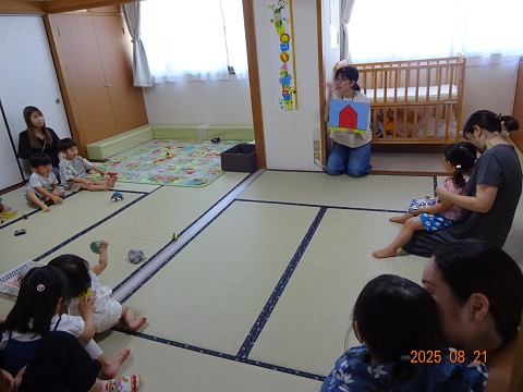 「こんにちはタイム」では、自己紹介とみんなが好きなあそびを聞いてみました。幼稚園に行っているおともだちは、幼稚園で好きなあそびを考えながら話してくれました。そして、紙芝居「ぱんぽこぽこ」では、みんなが声をだしたり、ジェスチャーをつけてのかけあいで盛り上がりました。