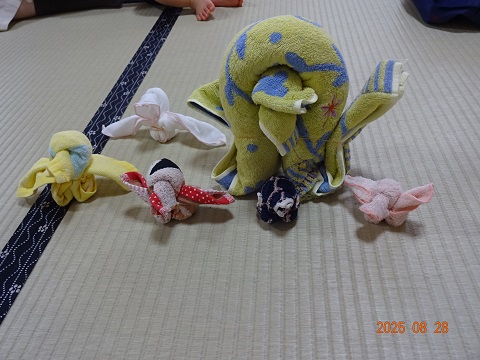 最後にタオルを折って、ペンギンを作りました。「鳥さん?」「ぞうさん?」・・・いろいろなものに見えて、それもまた、面白かったです。