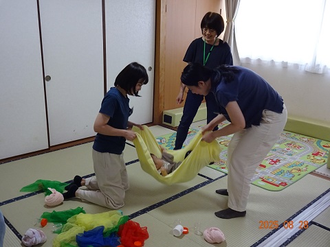 布あそびでは、ケースに入ったハンカチサイズの布、フェイスタオル、バスタオルであそんでみました。「暑い毎日、フェイスタオルやバスタオルをゆすり、風をおこしてあそぶだけでも楽しいねぇ~~」と。