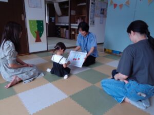 みんなでHappy Birthdayを歌ってから自己紹介と好きな食べ物をお聞きしました。「なんでも食べます」「ふりかけが好きです」など教えてくださいました。1歳さんはお母さんに代弁してもらっていましたが、3歳さんはなんと自分で答えてくれました!「大きな栗の木の下で」「どんないろがすき」「パンダうさぎコアラ」を歌いながら手遊びした後に大型絵本「おべんとうバス」を読んで終わりとなりました。
