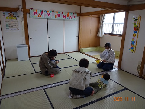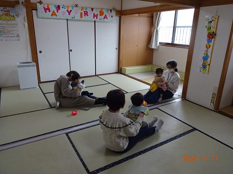 ふれあい遊びでは、「おすわりやっせ」を楽しみ、スタッフのおひざにちょこっと座りにきたお友だち、みんなでにっこりでした。
