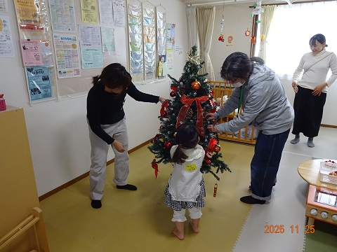 もうすぐ12月、大人もこどもも楽しみなクリスマス、今日はサプライズでクリスマスツリーの飾りつけをみんなにしてもらいました。出来上がって点灯すると、みんなの目がキラキラしていました。みんなのお家にサンタさん来るかな。。。