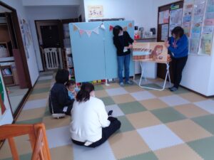 そして「どんないろがすき」の絵本をを歌いながら読み、次は寒い時期にぴったりの大型絵本「もりのおふろです」。動物たちと一緒に「ごしごし しゅっしゅっ」をしてお誕生会が終わりました。