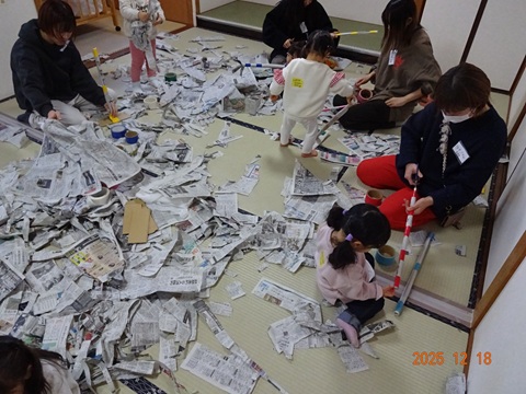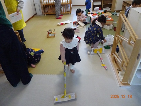 年末大掃除をテーマにモップを新聞紙と段ボールを使って作ってあそびました。お家でお母さんやお父さんが使っているのをしっかり見ているんだね~~と、上手にモップがけをしてあそんでいるこどもたちの姿に和ませてもらった大人たちでした。