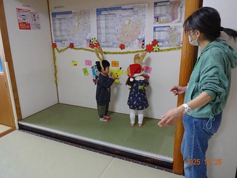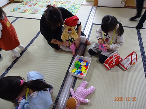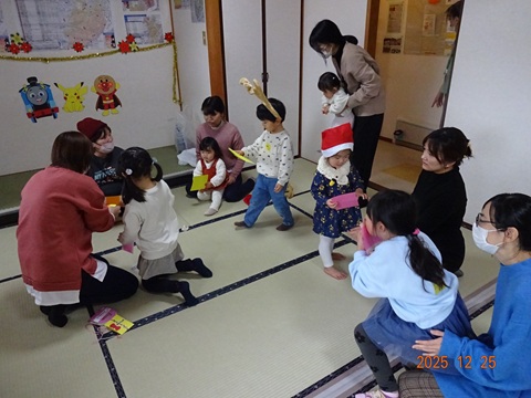 手づくりカバンを使ったゲームを考えて準備してくださいました。ゲームの後は、床の間ステージで「あわてんぼうのサンタクロース」をみんなで歌いました。その後、しばらくクリスマスの写真撮影タイムが続きました。