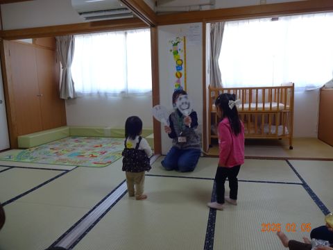 恒例の“こんにちはタイム”では、ペープサートや紙芝居を楽しみました。ふりをつけるとみんな真似っこが上手!そして、みんなにお名前を尋ねると、小さな声ですが上手に自分の名前を教えてくれます。「みんな大きくなったんだね~」そんなステキな“こんにちはタイム”になりました。
